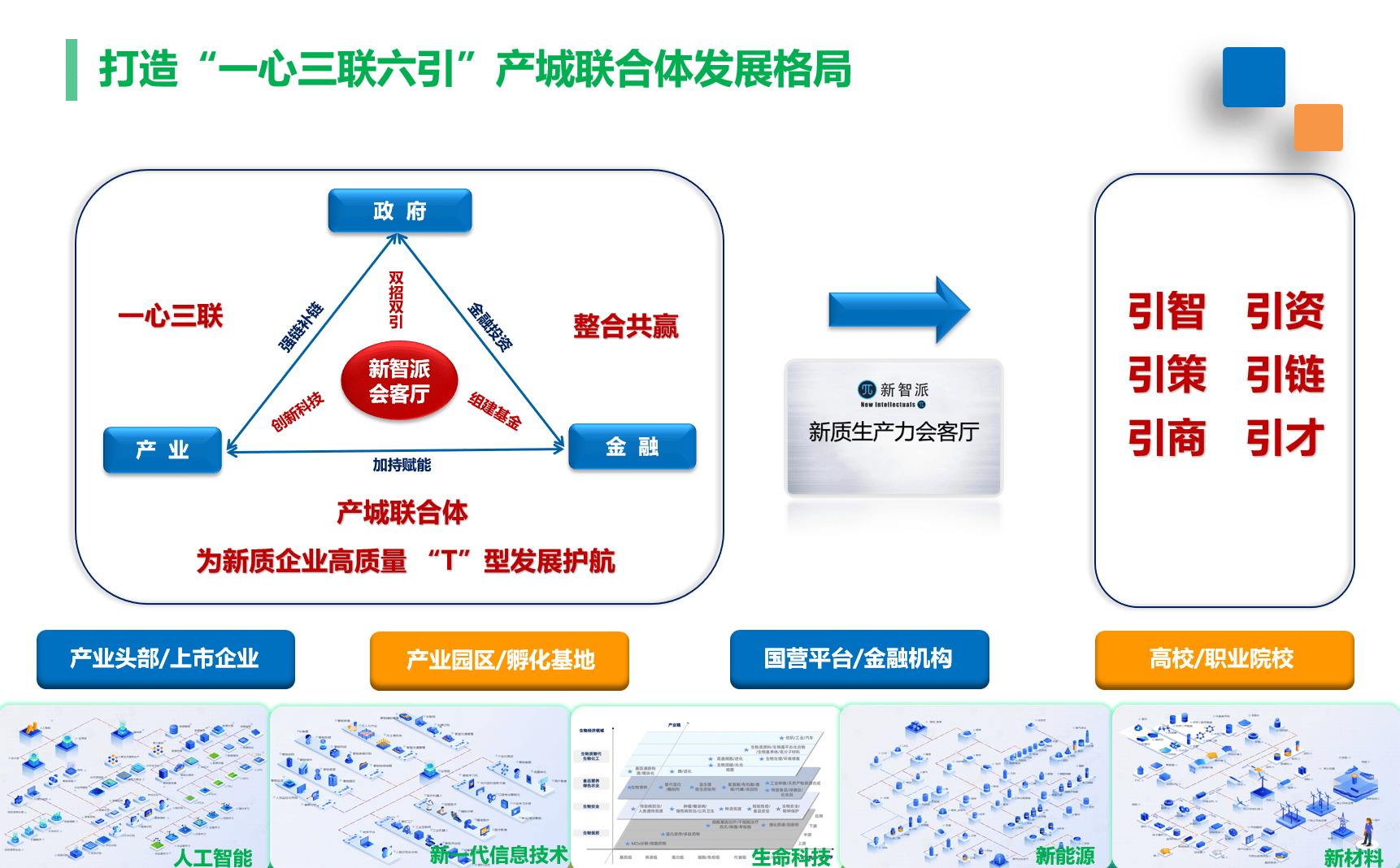 「新智派新质生产力会客厅——横向资源整合与生态化聚合赋能平台」汇聚了来自国家级行业协会组织、国家级智库研究院、国家级媒体平台、基金、证券投行、银行金融机构、央国企和行业领域优势企业和项目资源,会客厅为政府端、科研端、企业端、金融端、产业端搭建一个共享共创、合作共赢的平台,通过建链、补链、强链、延链,“青云赋能”聚焦「专、精、特、新、质」,围绕“新质生产力”和“专精特新”为科技创新项目赋能助力,并执行「“请”上来 走“下去」的循环机制方针,实现企业与市场,创新与应用,供与销链接的桥梁。